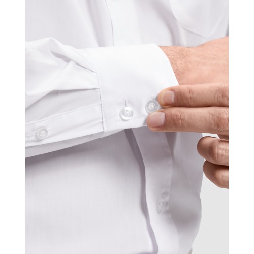 Camisa de manga comprida e colarinho clássico engomado de 1 botão. · Bolso frontal esquerdo. · Punho com dois botões e cós arredondado. · Fácil de passar a ferro.